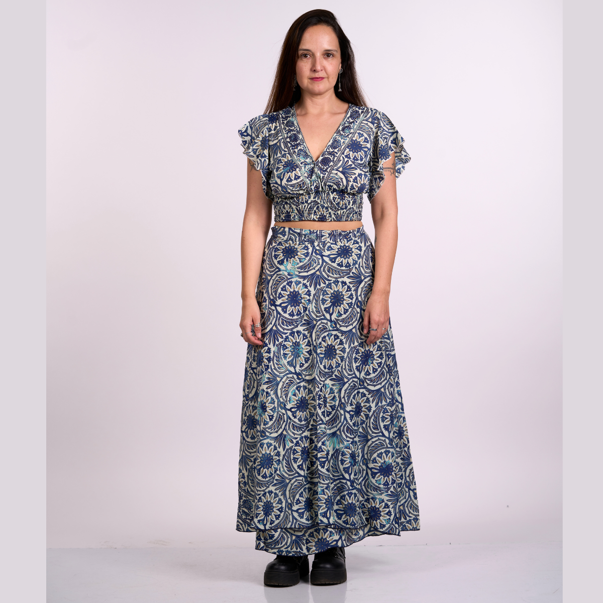 Hermoso top de seda con cuello en V. Tiene mangas cortas que caen con ondas. Elasticado en la cintura. Queda hermoso!