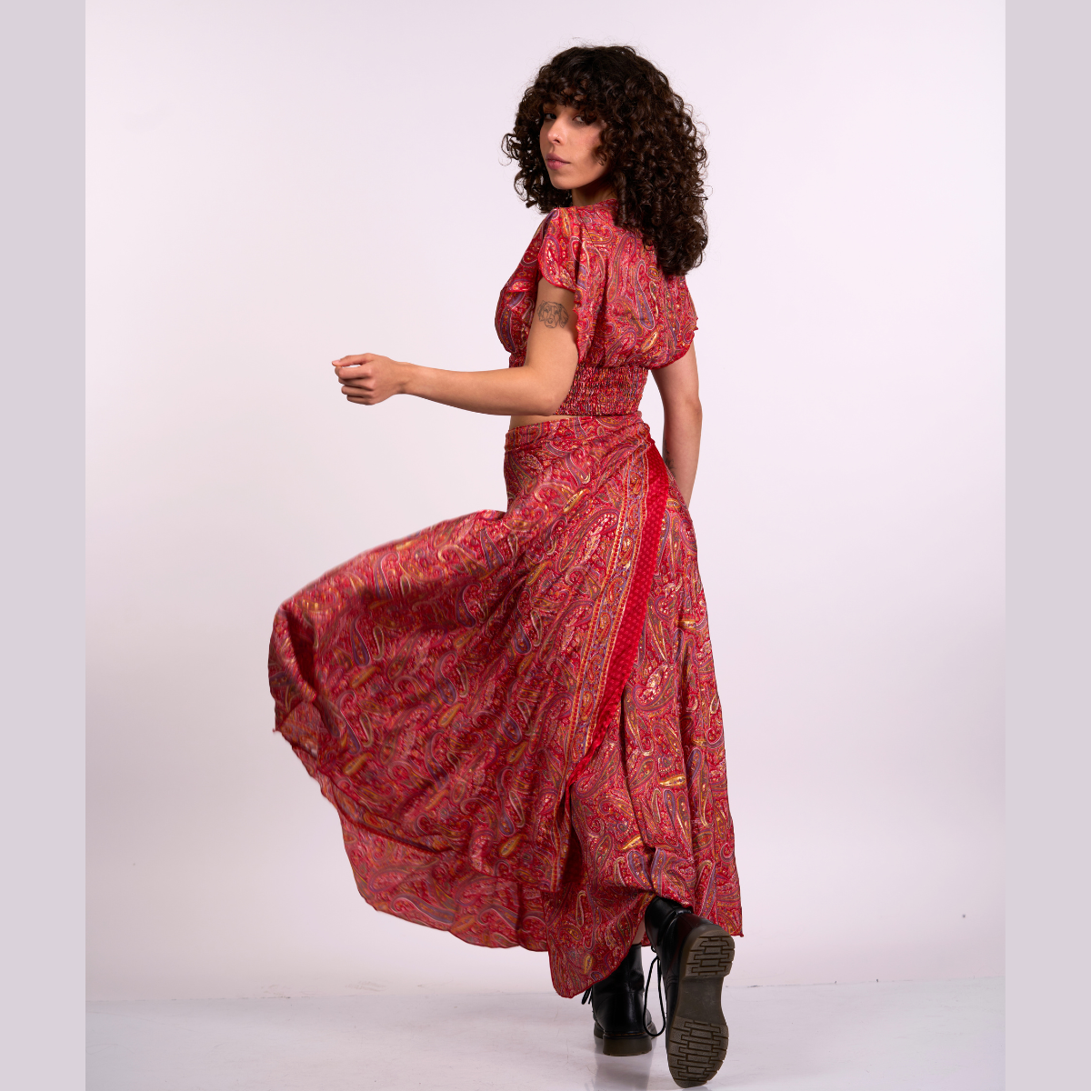 Hermoso top de seda con cuello en V. Tiene mangas cortas que caen con ondas. Elasticado en la cintura. Queda hermoso!